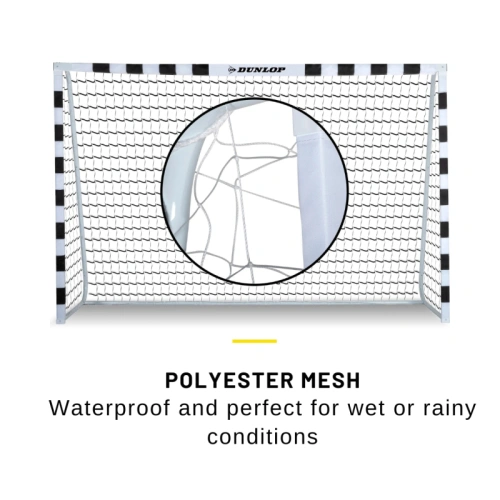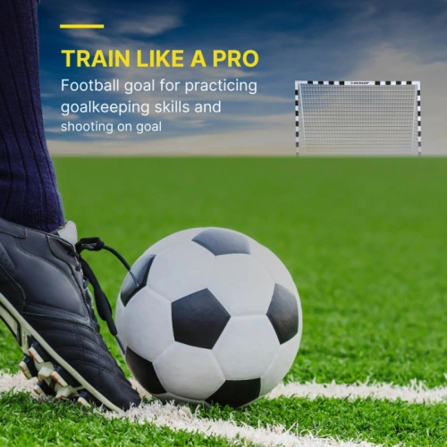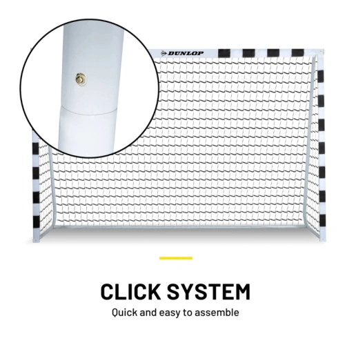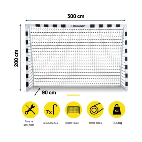 Черно-бялата рамка е изработена от здрав метал и може да се сглоби бързо и лесно с помощта на щракваща система. Включени са седем колчета за допълнителна стабилност, гарантиращи, че вратата ще стои здраво в земята и няма да се преобърне лесно. С размери 300 x 90 x 200 см, вратата е подходяща за футболисти от всички възрасти. Предизвикайте приятелите, семейството, родителите или дори съседите си на вълнуващ мач! Кой ще вкара повече голове?